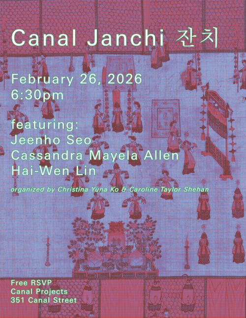 To start the lecture series, artist Christina Yuna Ko will guide a somatic and writing exercise to open the Janchi 잔치 and cultivate its intimate yet convivial atmosphere. Driven from research into ritual and its role in the diasporic home, Canal Janchi 잔치 conceptualizes the Korean word for town festivals/feasts to make space to share the threads connecting ourselves and our contexts revealed in the daily life material of garments. Alongside the opening exercises, Christina will adorn the space with hanging textiles reimagining Janchi 잔치 from her archives and memories, while also drawing upon the Buddhist framework of ritual adornment janguhm (장엄) to help us carry conversations that center the experience of garments as embodied and beyond the self.