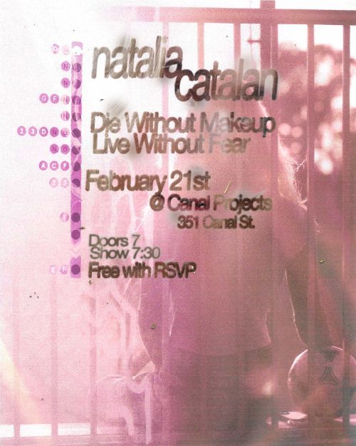 On February 21 at Canal Projects, Natalia Catalan will present her live performance “Die Without Makeup Live Without Fear,” featuring music from her debut recording Die Without Makeup. This performance is described as “Dumb Blonde 40-Inch Vertical Noise Easy Listening Educator Mother Daughter Standard Deviant Art.” Catalan will be joined by pianist Warner Meadows, vocalist Alana Markel and drummer Rory Dolan.