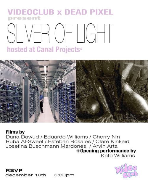 Sliver of Light is a collaborative event between VIDEOCLUB, an international platform led by Belen Mallol, Vicente Barriga, and Clo Pantano dedicated to underground, DIY experimental video, and Dead Pixel, a New York City–based screening series presented by Cherry Nin. Together at Canal Projects, they present works that trace the materiality of industrialization, digital systems, and artificial intelligence, centering the affirmation of life in opposition to logics of extraction, control, and erasure. The program features a diverse array of methods and technologies—including glitch, found footage, narrative, and performance—that artists employ to challenge dominant narratives and propose apocalyptic articulations of connection, sexuality, and transmutation.