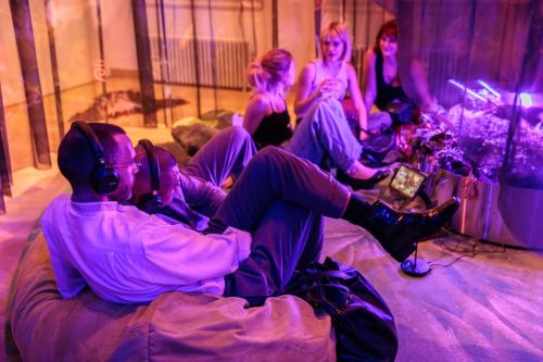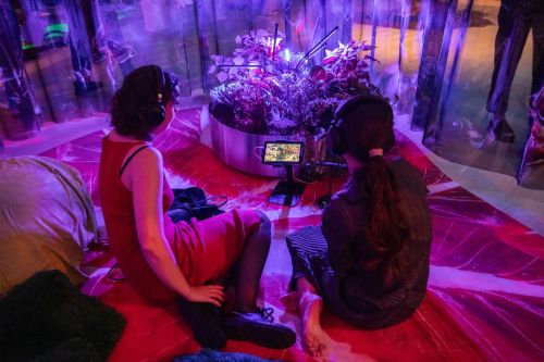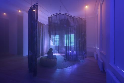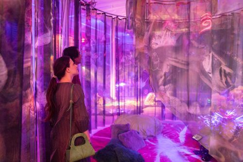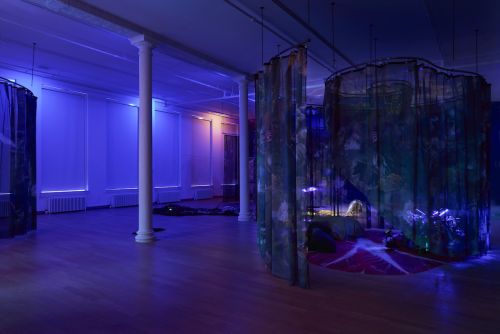 Inspired by Jeremy’s quest for partnership, the immersive environment serves as a reflection upon his extraordinary life and exercises the promise of interspecies knowledge building. Upon entering Canal Projects, visitors will encounter areas where human and snail habitats merge. Long columns of curtains arranged like the spiral of a snail’s shell create enclosures filled with salad-leaf pillows and carpets, live plants, and robotic snails. The installation is accompanied by three songs written by Duk Hee and composed by musician Sasha Perera that collage together scientific facts about Jeremy sourced from the internet, which visitors are encouraged to listen to as they lay in the rest areas. The artist invites us to slow down and experience life at a snail’s pace, promoting a sense of shared existence and mutual care.