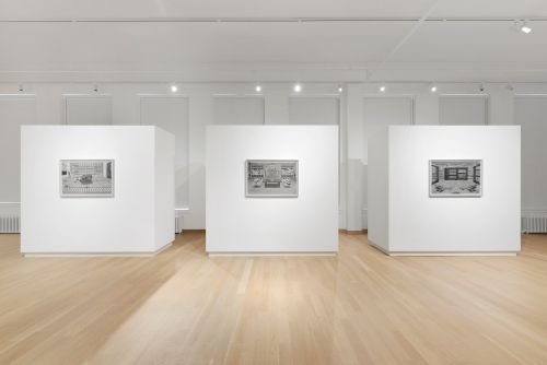 Kyung-Me’s three works on view from the series Papillon de Nuit (2019) share this mood of suspension and psychologically tautness. The Brooklyn-based artist operates within a rigid sense of order, creating meticulously detailed interior settings that have a near perfect symmetry of mirrors, columns, curtains, and spotlights. At first, each scene appears empty. Looking more closely, the viewer can find reference to the depicted space’s occupant in each: a hand draped over the arm of a chair, or an abandoned shoe. The works give the sense of something darker lurking in the shadows, almost as if these ornate modern homes have overtaken their inhabitants.