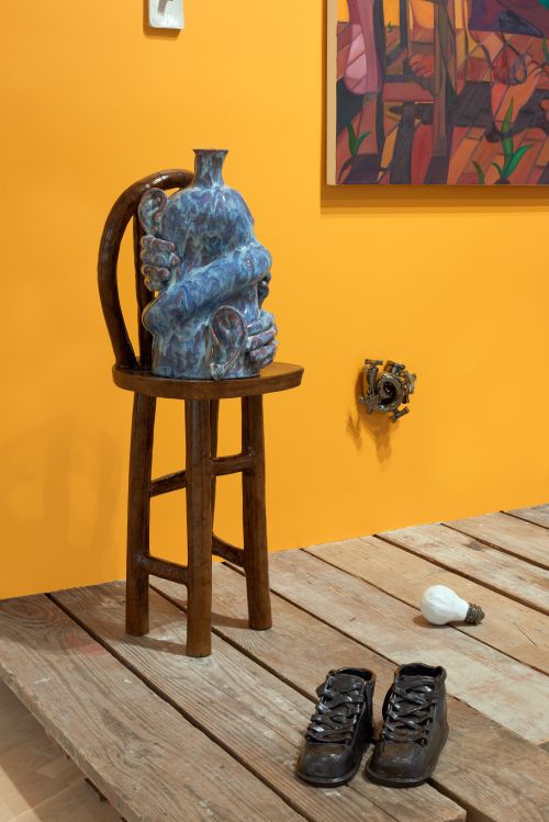 San Francisco-based artist Woody De Othello is known for his reimagining of domestic spaces where perspective seems to melt away and twist into surreal new forms. In vivid, saccharine color the artist abstracts oversized figures and objects through ceramic sculptures and paint. For Dwelling, De Othello has created a free-standing tableau of these anthropomorphized objects and imagery which act as a center stage for the exhibition’s metaphorics of interiority.