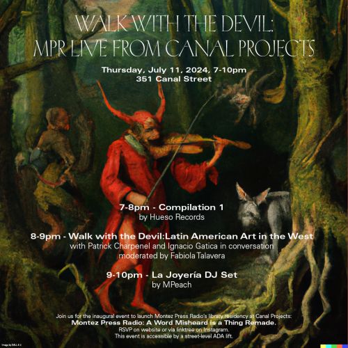 Thursday, July 11, 2024, 7–10pmJoin us for the inaugural event for Montez Press Radio’s library residency at Canal Projects: Walk with the Devil: MPR Live from Canal Projects. MPR’s first sub-resident Fabiola Talavera has curated a full program for the evening, including a playlist designed by Hueso Records and a conversation between Patrick Charpenel and Ignacio Gatica. Following the conversation, MPeach will bless us with a DJ set. Full schedule below, come join us for a cold drink and a good time! RSVP here.