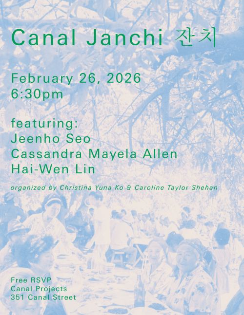 To start the lecture series, artist Christina Yuna Ko will guide a somatic and writing exercise to open the Janchi 잔치 and cultivate its intimate yet convivial atmosphere. Driven from research into ritual and its role in the diasporic home, Canal Janchi 잔치 conceptualizes the Korean word for town festivals/feasts to make space to share the threads connecting ourselves and our contexts revealed in the daily life material of garments. Alongside the opening exercises, Christina will adorn the space with hanging textiles reimagining Janchi 잔치 from her archives and memories, while also drawing upon the Buddhist framework of ritual adornment janguhm (장엄) to help us carry conversations that center the experience of garments as embodied and beyond the self.
