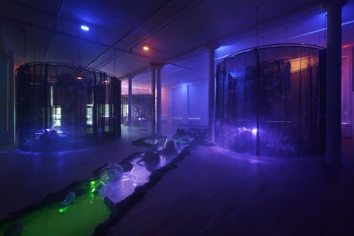 Having both male and female reproductive organs, snails possess electromagnetic abilities to have sex and telepathic abilities to exchange their thoughts and feelings. Taking Jeremy’s story and the unique qualities of snail sexuality as the subject of this piece, Duk Hee, who identifies as non-binary, continues an artistic exploration of “sex ecologies,” pushing against western, patriarchal norms of sexual understanding to highlight the exuberant sexual possibilities and survival strategies of the more-than-human world. Jeremy’s journey from isolation to finding a mate is paralleled by moments of kinship that arise between human visitors and robotic snails that Duk Hee has arranged in various snail habitats throughout the exhibition.